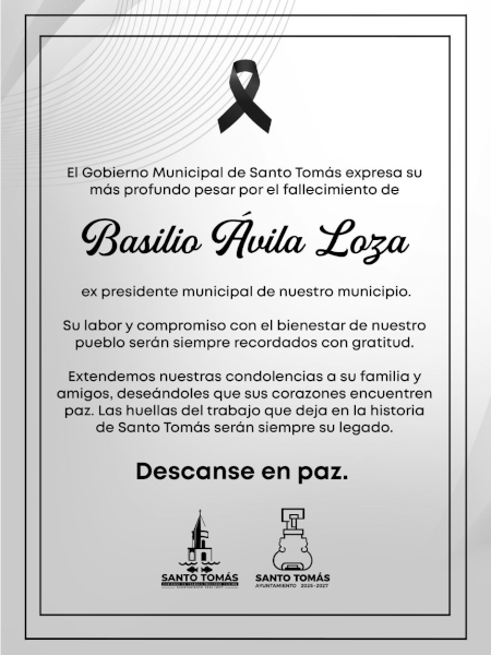 Lamenta profundamente el fallecimiento del C. Basilio Ávila Loza, Ex Presidente de Santo Tomas